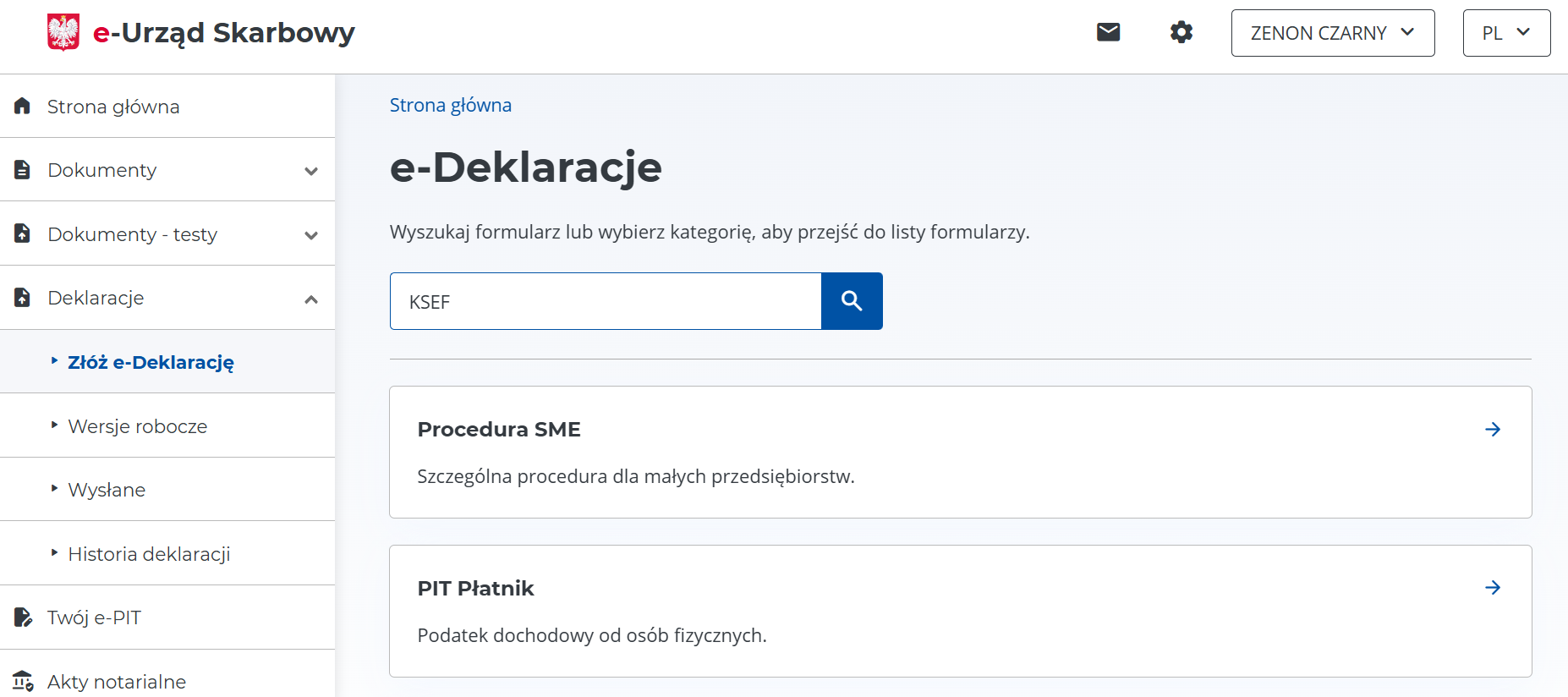- W menu bocznym wybierz „Deklaracje", a następnie „Złóż e-Deklarację":