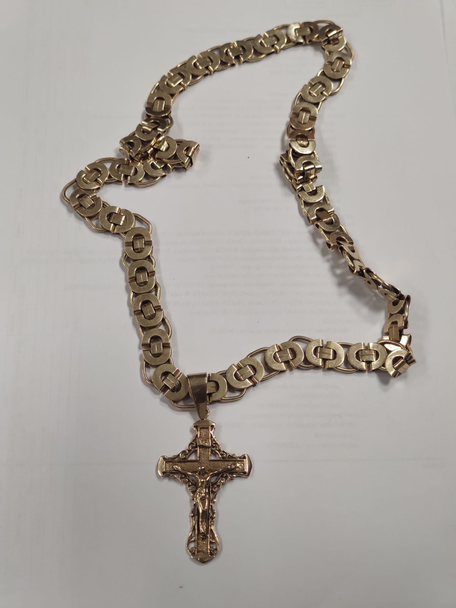 Złoty łańcuszek z zawieszką w kształcie krzyża wykonany ze złota próby 585 o łącznej wadze 131,07 gram.
