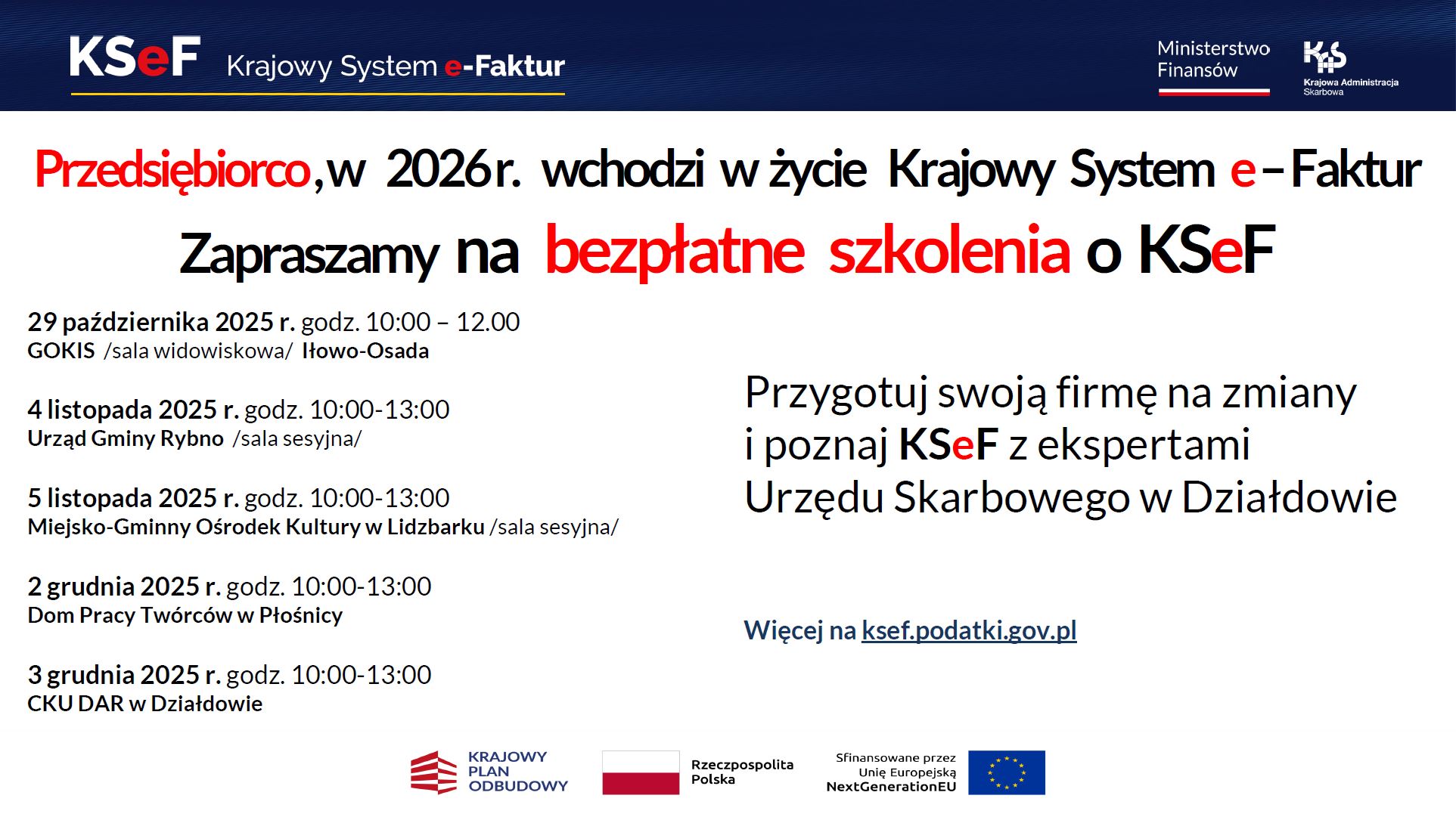 Naczelnik Urzędu Skarbowego w Działdowie zaprasza na bezpłatne szkolenia o KSeF w powiecie działdowskim.