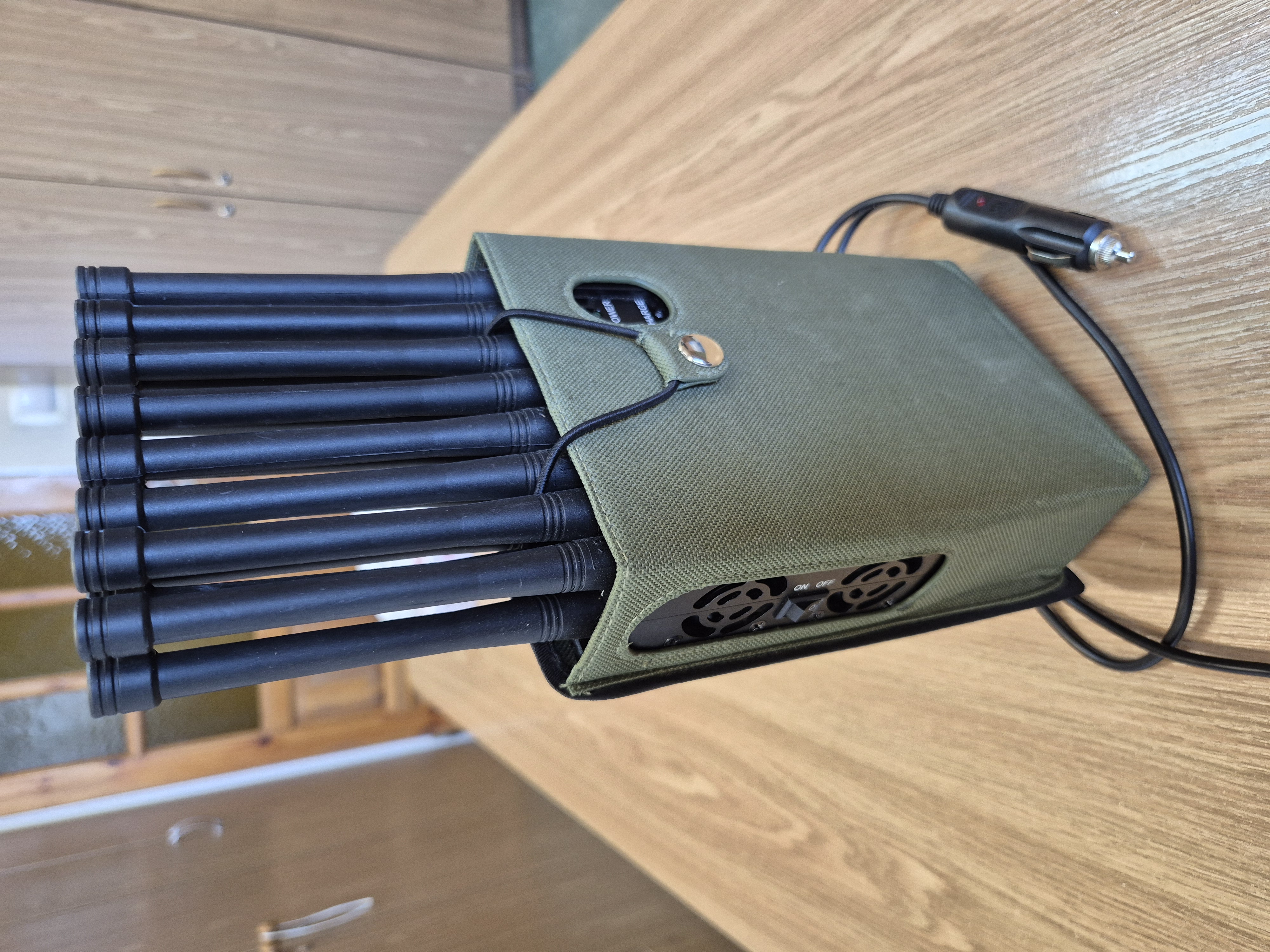| 1 | Elektroniczne urządzenie koloru czarnego w parcianym etui z wystającymi 16 antenami wraz z kablem zasilającym (zagłuszacz sygnałów 3g, 4g, 5g LTE, GPS, WiFi, SOS) | 3000 zł | 2250 zł | ---------- |