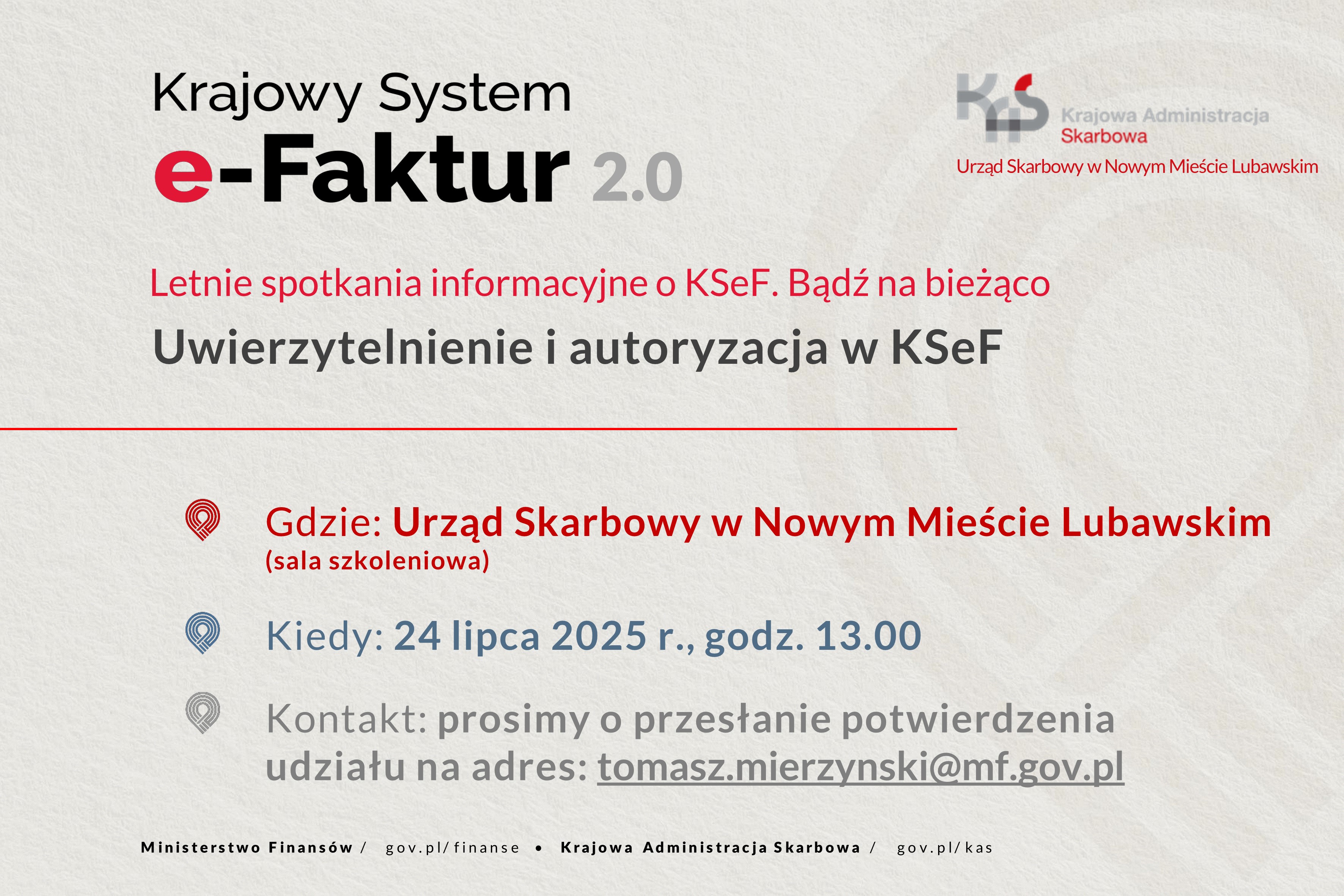 Urząd Skarbowy w Nowym Mieście Lubawskim zaprasza na darmowe spotkanie informacyjne z cyklu „Letnie spotkania informacyjne o KSeF. Bądź na bieżąco":