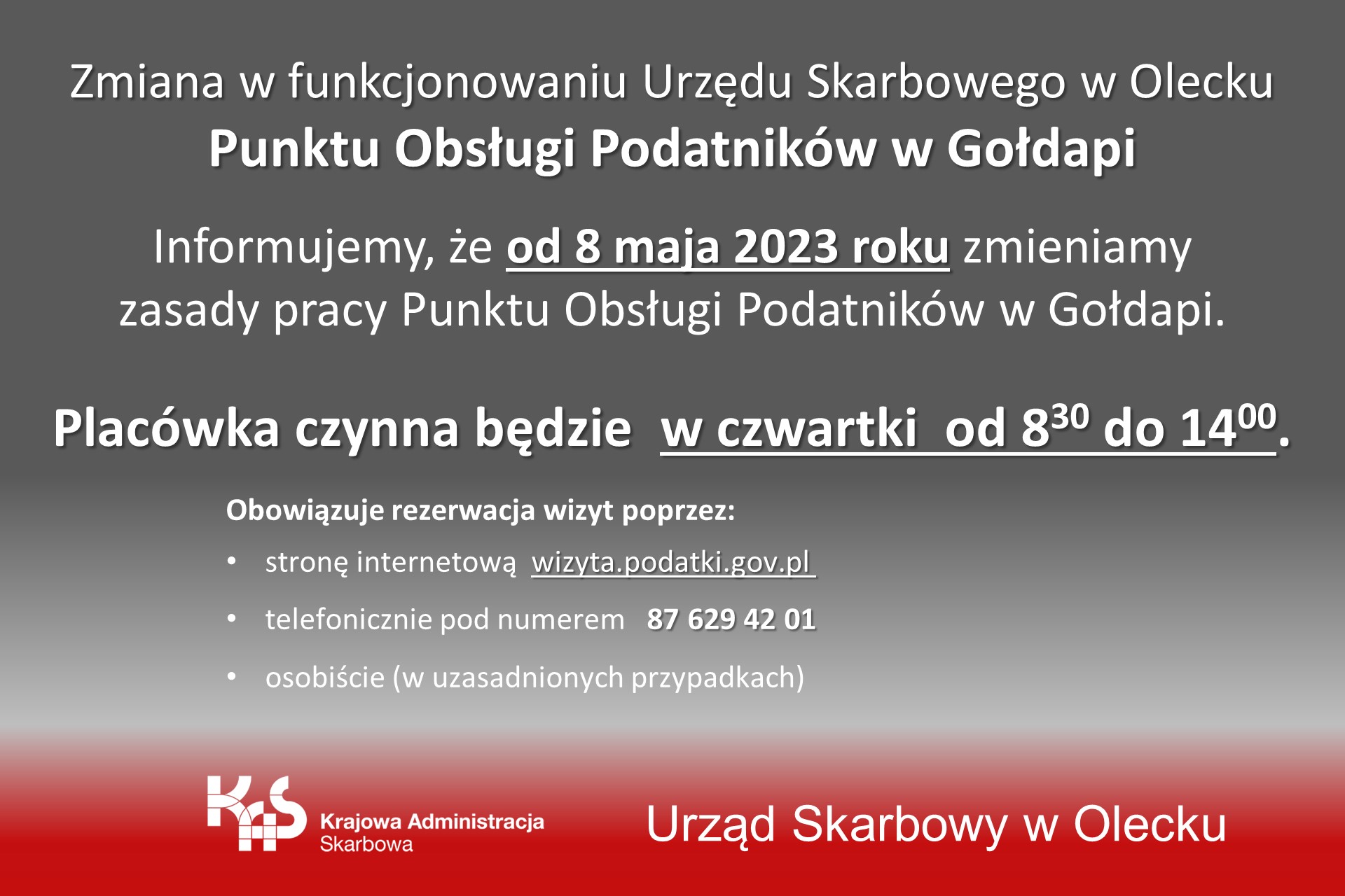 Informujemy, że od 8 maja 2023 roku zmieniamy zasady pracy Punktu Obsługi Podatników w Gołdapi.