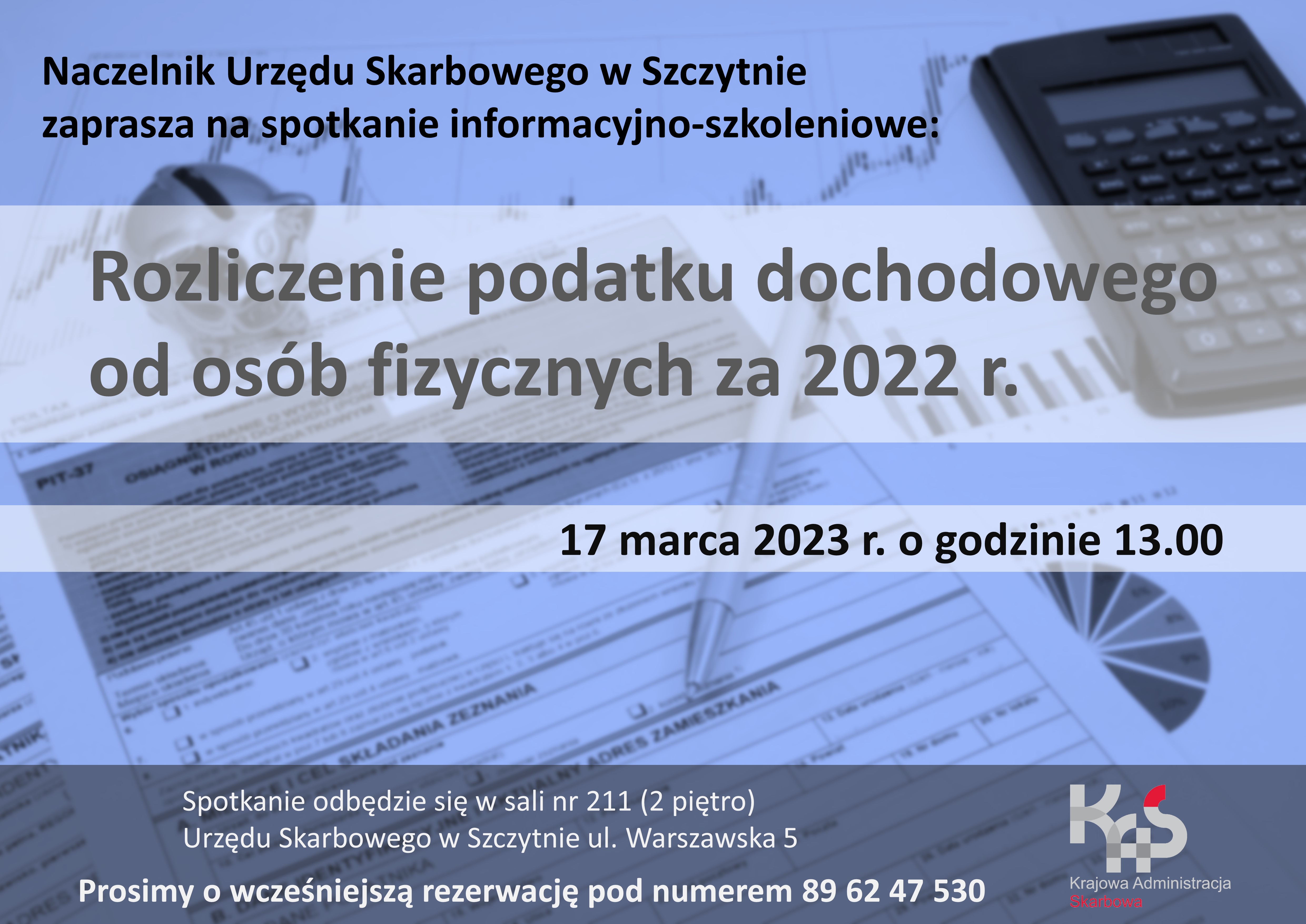Naczelnik Urzędu Skarbowego w Szczytnie zaprasza na szkolenie „Rozliczenie podatku dochodowego od osób fizycznych za 2022 r." w dniu 17 marca 2023 r. o godz. 13.00.
