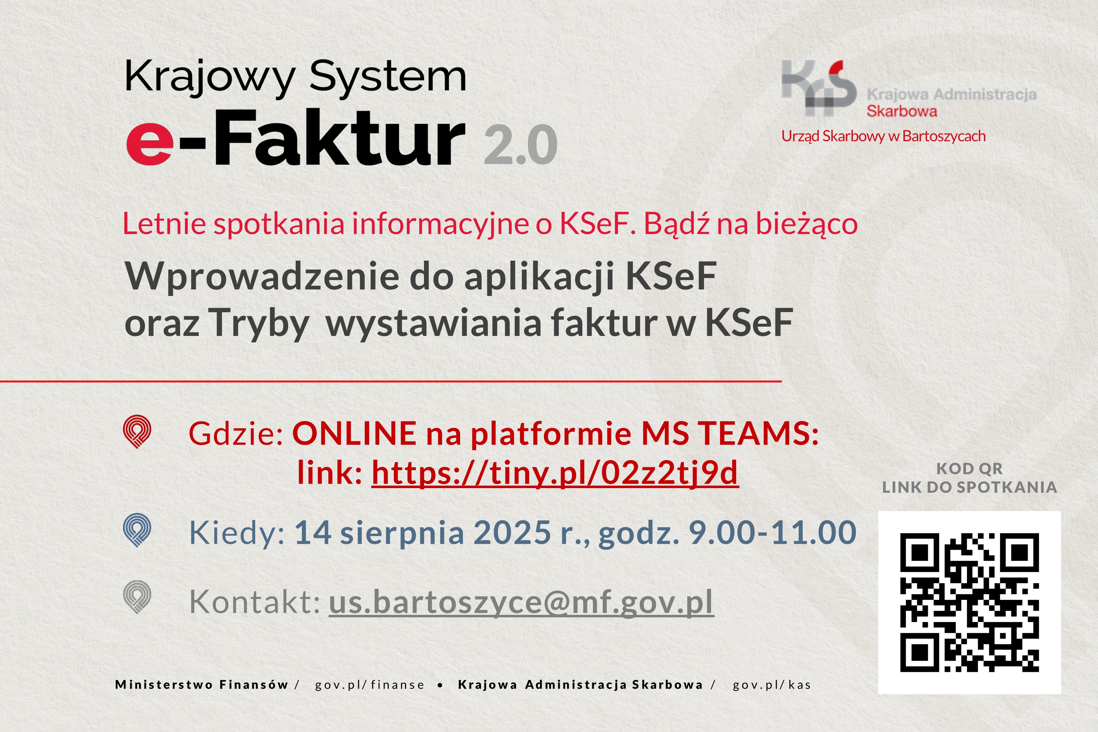 Urząd Skarbowy w Bartoszycach zaprasza na darmowe spotkanie ONLINE z cyklu „Letnie spotkania informacyjne o KSeF. Bądź na bieżąco":