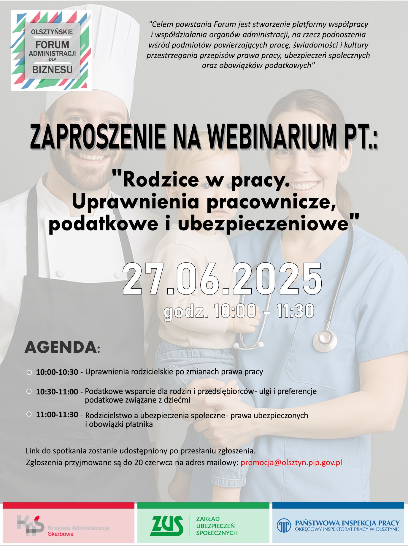 Zapraszamy na webinarium „Rodzice w pracy. Uprawnienia pracownicze, podatkowe i ubezpieczeniowe", zorganizowane we współpracy z olsztyńskim oddziałem Zakładu Ubezpieczeń Społecznych oraz Okręgowym Inspektoratem Pracy w Olsztynie. Będzie to kolejne spotkanie w ramach działalności Olsztyńskiego Forum Administracji dla Biznesu.