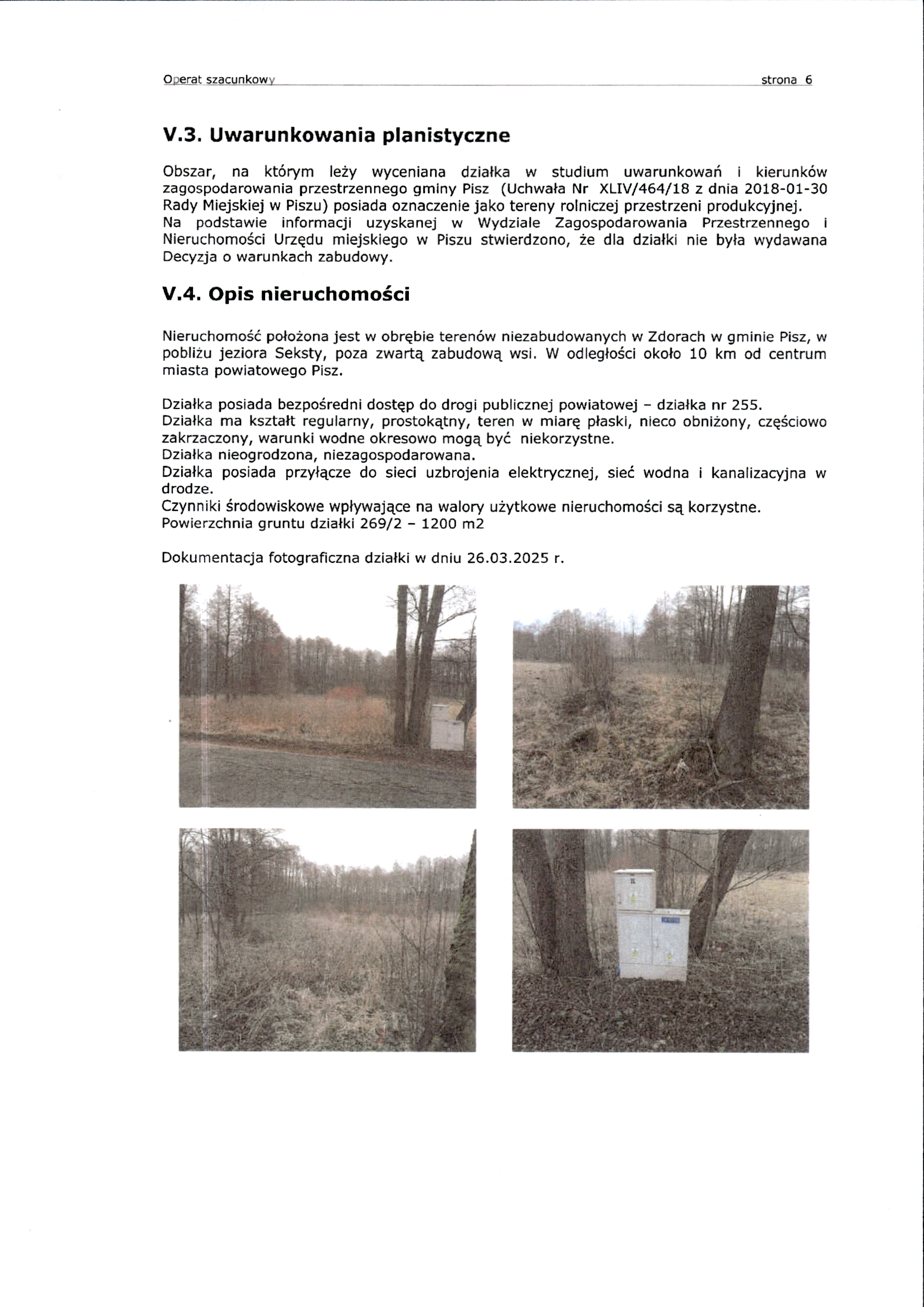 Nieruchomość położona jest w obrębie terenów niezabudowanych w Zdorach w gminie Pisz, w pobliżu jeziora Seksty, poza zwartą zabudową wsi, w odległości około 10 km od centrum miasta powiatowego Pisz. Posiada dostęp do drogi publicznej powiatowej, jest nieogrodzona i niezagospodarowana. Ma kształt regularny, prostokątny, teren w miarę płaski, nieco obniżony, częściowo zakrzaczony, warunki wodne okresowo mogą być niekorzystne. Działka posiada przyłącze do sieci uzbrojenia elektrycznej, sieć wodna i kanalizacyjna w drodze. Czynniki środowiskowe wpływające na walory użytkowe nieruchomości są korzystne.