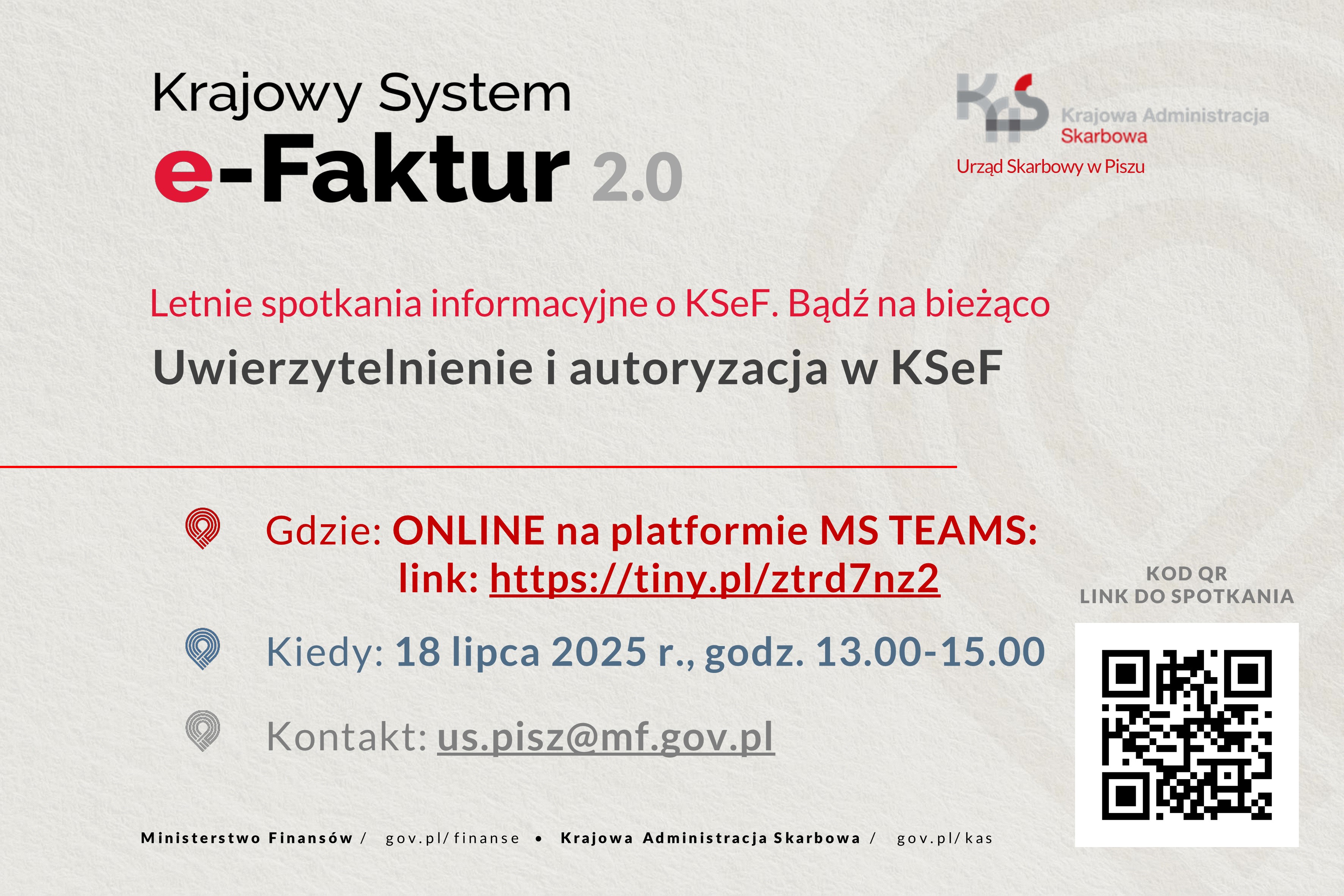 Urząd Skarbowy w Piszu zaprasza na darmowe spotkanie ONLINE z cyklu „Letnie spotkania informacyjne o KSeF. Bądź na bieżąco":