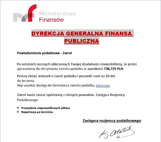 - Do użytkowników poczty elektronicznej trafiają wiadomości dotyczące otrzymania „zwrotu pieniędzy za ostatni rachunek podatkowy".