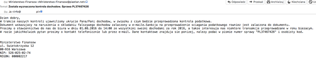 Oto przykładowa treść fałszywej wiadomości dotyczącej „wyznaczonej kontroli dochodów":