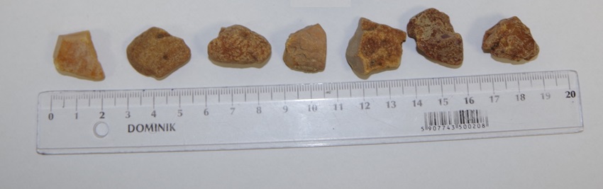 Pod koniec października br. funkcjonariusze z Oddziału Celnego w Bezledach skierowali samochód osobowy marki Peugeot, którym podróżował obywatel Federacji Rosyjskiej, do kontroli przy pomocy urządzenia RTG. Odczyt obrazu skanera wskazywał, że za tylną kanapą może być ukryta kontrabanda. W trakcie dalszych czynności okazało się, że oparcie kanapy przykręcone jest do blaszanej ścianki w bagażniku, tworząc przestrzeń do ukrycia towarów. Po demontażu siedzenia, funkcjonariusz dokonujący rewizji stwierdził, że w belce pod kanapą wycięto dwa prostokątne otwory zakryte kawałkami przykręconej blachy. Po jej odkręceniu okazało się, że belka wypełniona jest kawałkami bursztynu. Łącznie w specjalnie skonstruowanej skrytce znajdowało się 8,9 kg jantaru. Były to kawałki nieobrobionego kamienia. Wstępnie jego wartość oszacowano na ok 10 tys. zł. Wobec Rosjanina wszczęto postępowanie karne skarbowe, a pojazd został zatrzymany na celniczym parkingu ze względu na przeróbki konstrukcyjne.